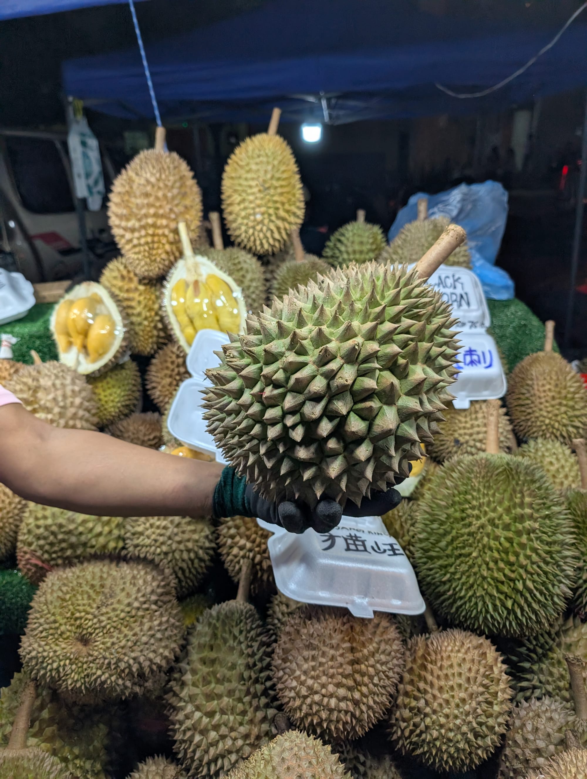 マーケットの店員さんの猛攻を交わしつつ、ゆっくり歩きながら吟味していると、またもや初めて遭遇するドリアンを発見。