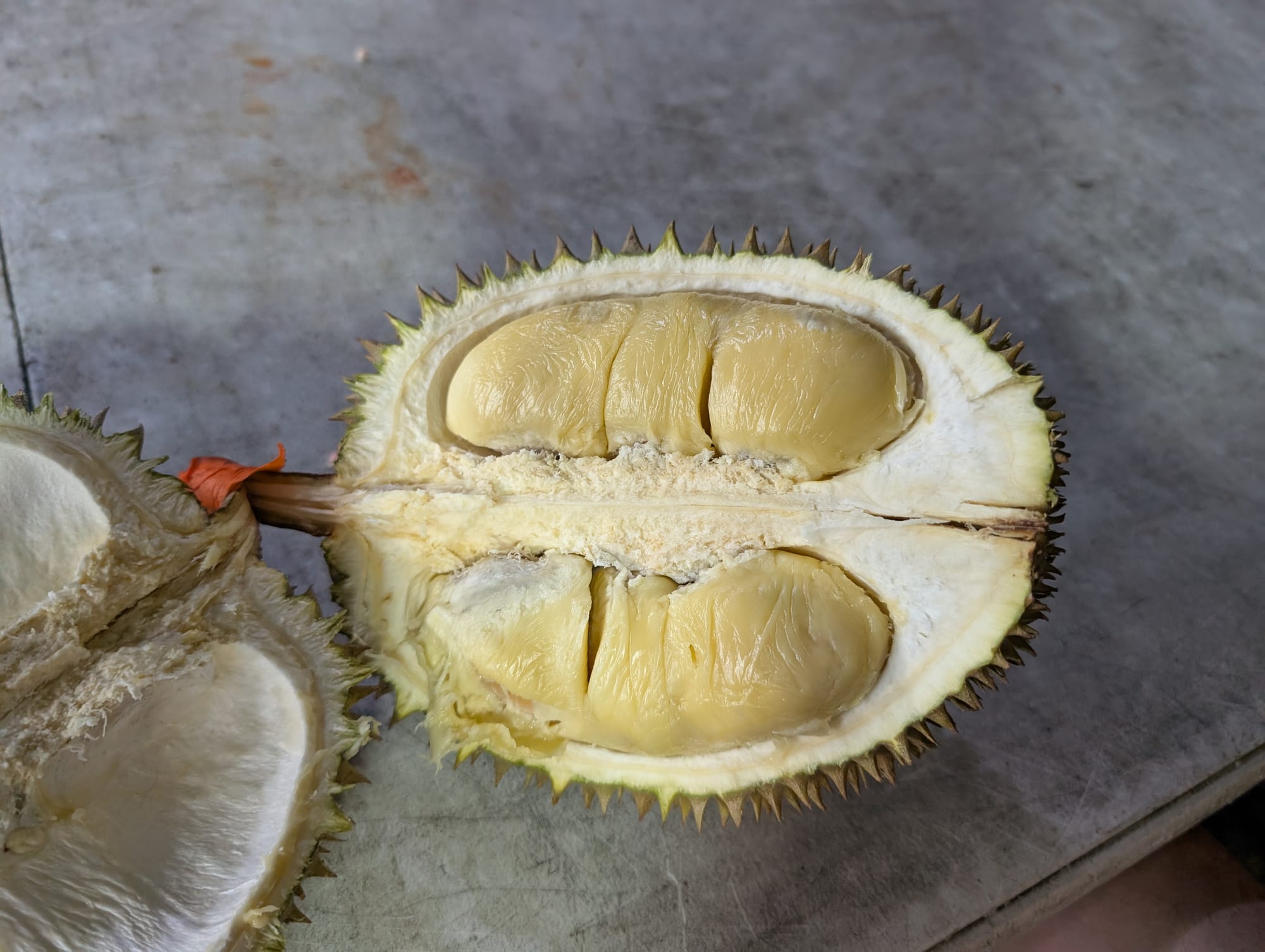 正確には、サラワクキングは登録品種ではないので名乗ったもの勝ちだが、サラワクキングは房がより白くカンポンに近い素性のドリアンだ。