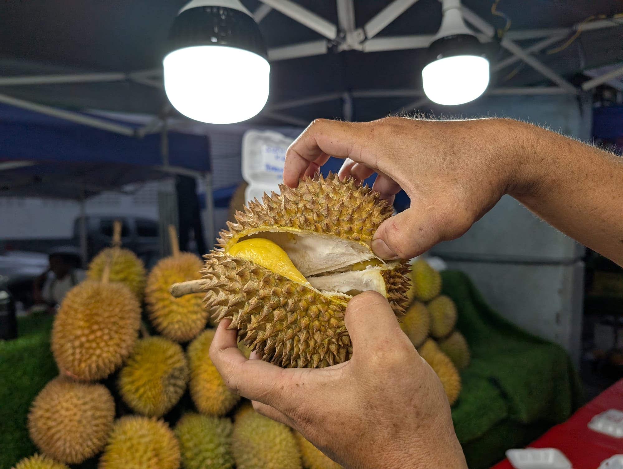 夜になるとドリアンナイトマーケットも客が増え、店員さんがドリアンを開ける際の威勢の良い掛け声があちこちに響き渡る。