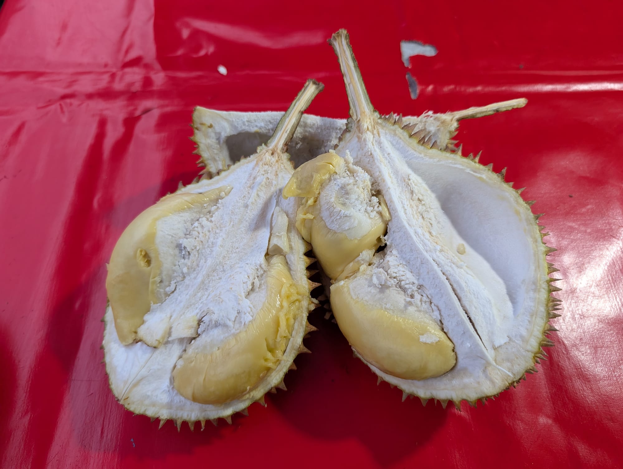 薄皮の状態から追熟品と思われるが、追熟じゃなければもっと美味しく食べられそうなドリアンである。