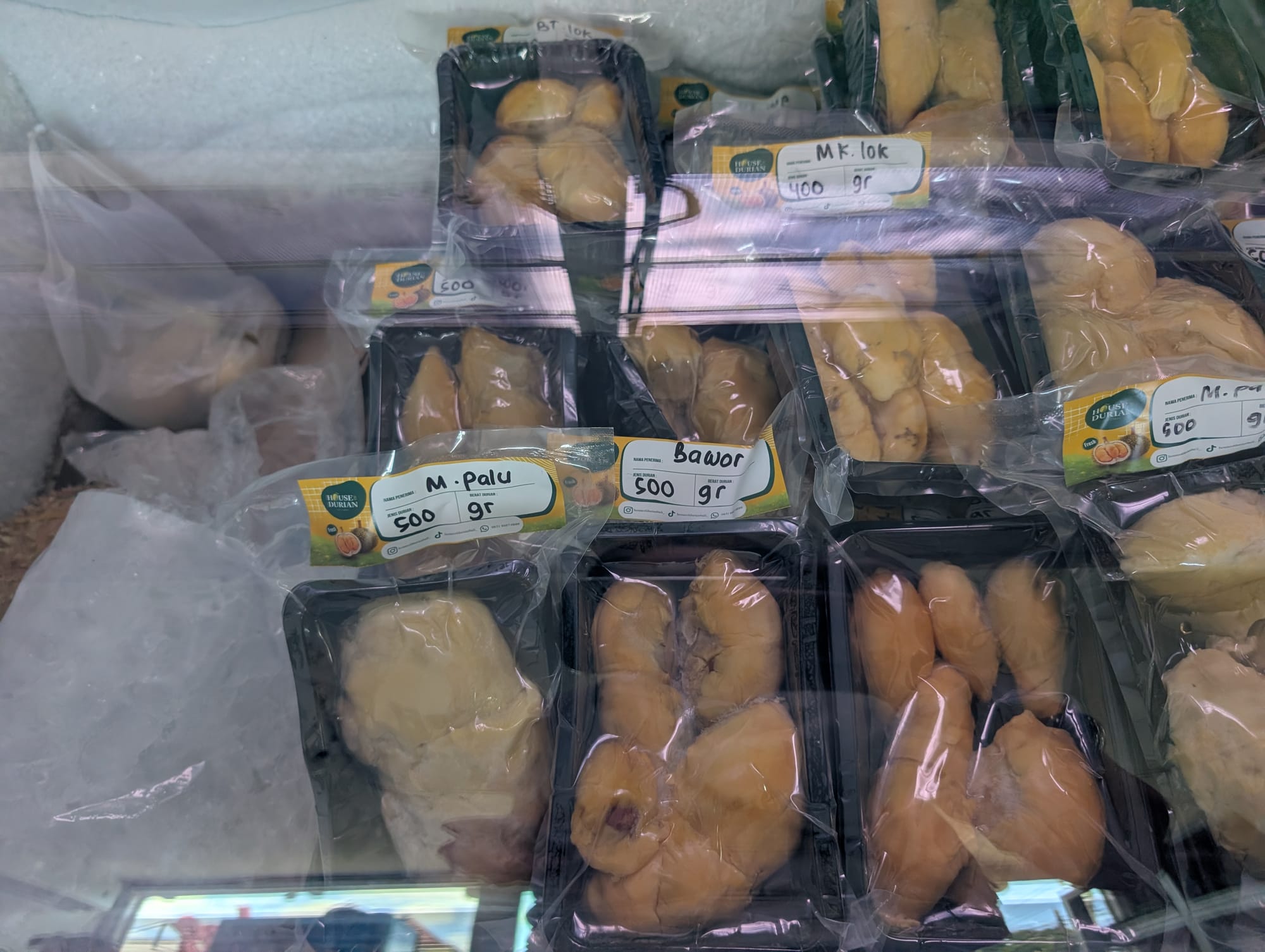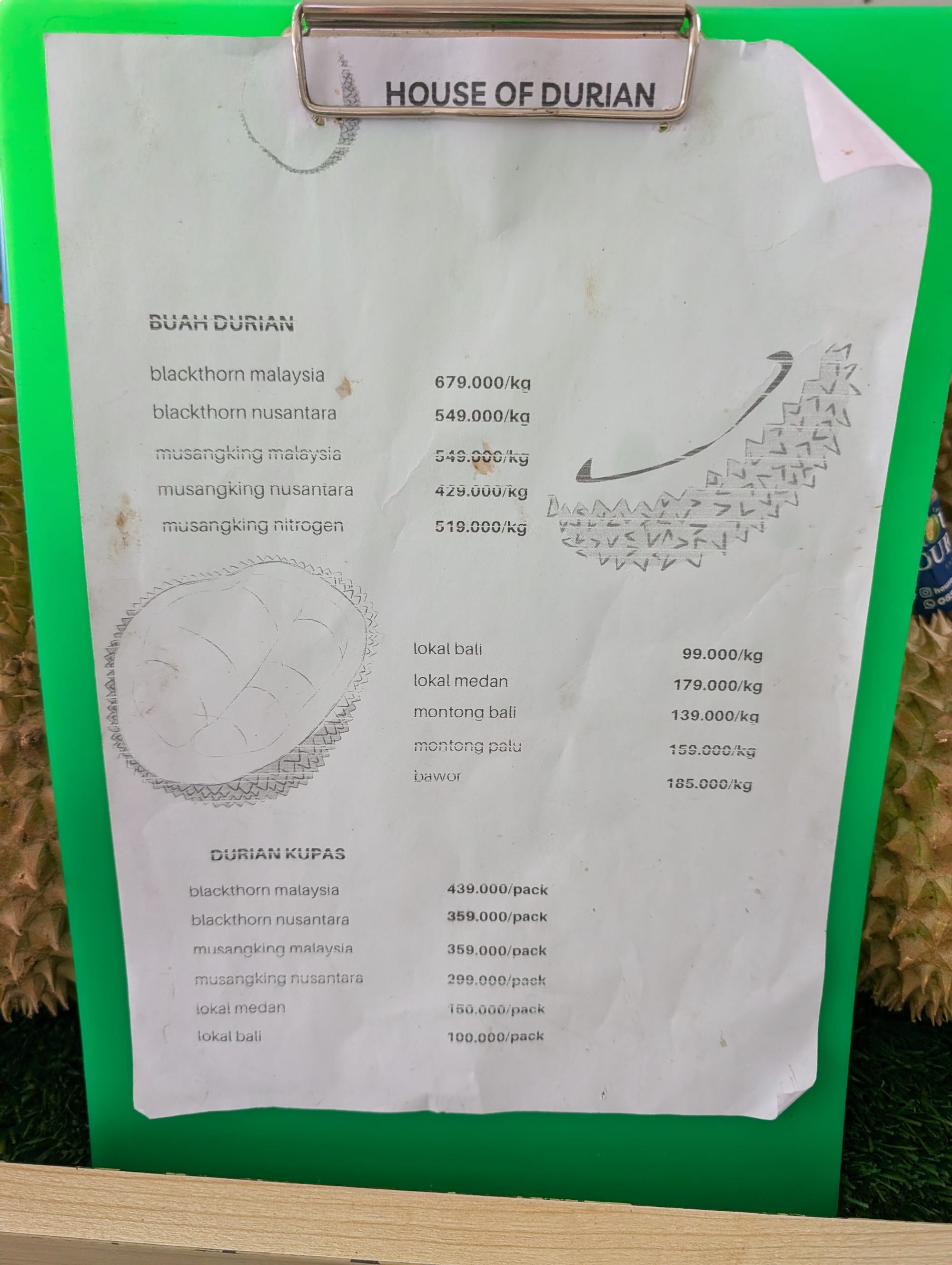 この日置いてあった生のドリアンは上記2種類のみだが、価格リストにはインドネシアの新しい首都となるヌサンタラ産ブラックソーンや、メダン産ドリアン、マレーシア産猫山王など様々な品種のドリアンが載っている。