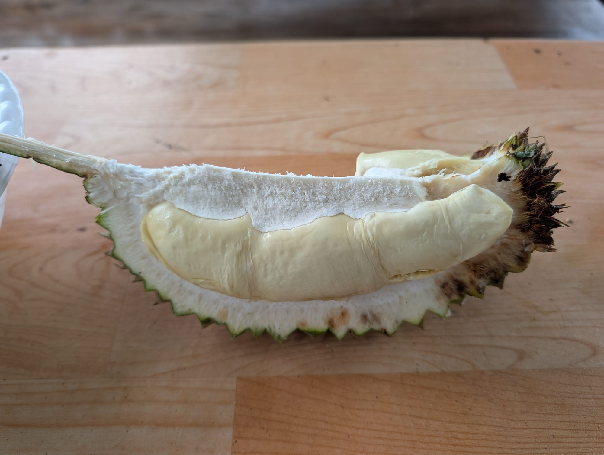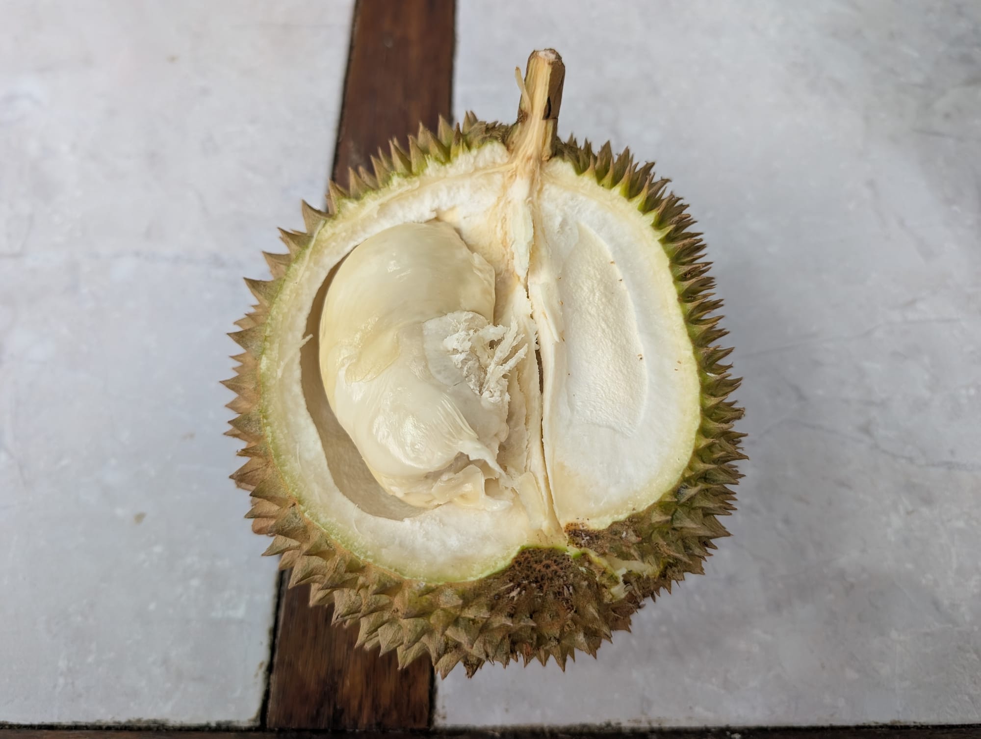 いや〜、最後にいいドリアンを引いたと思いバクバク食べ進めると、何と最後の房で虫食いに当たってしまった🐛