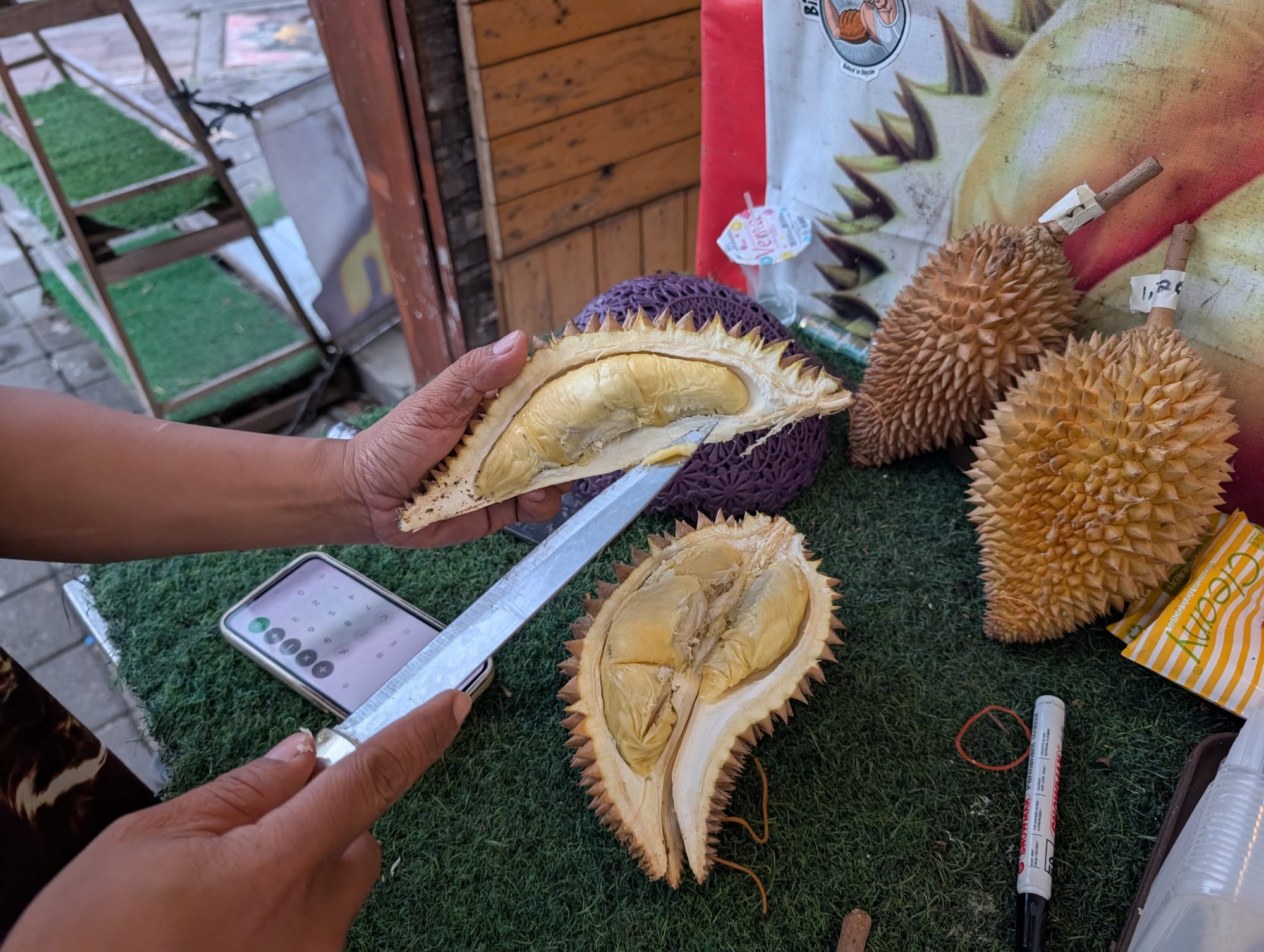 あまり細長いドリアンは実入りの観点から好ましくないのだが、この日は小ぶりで熟し具合の良いモントーンの在庫が限られていたためこちらの玉を選択。