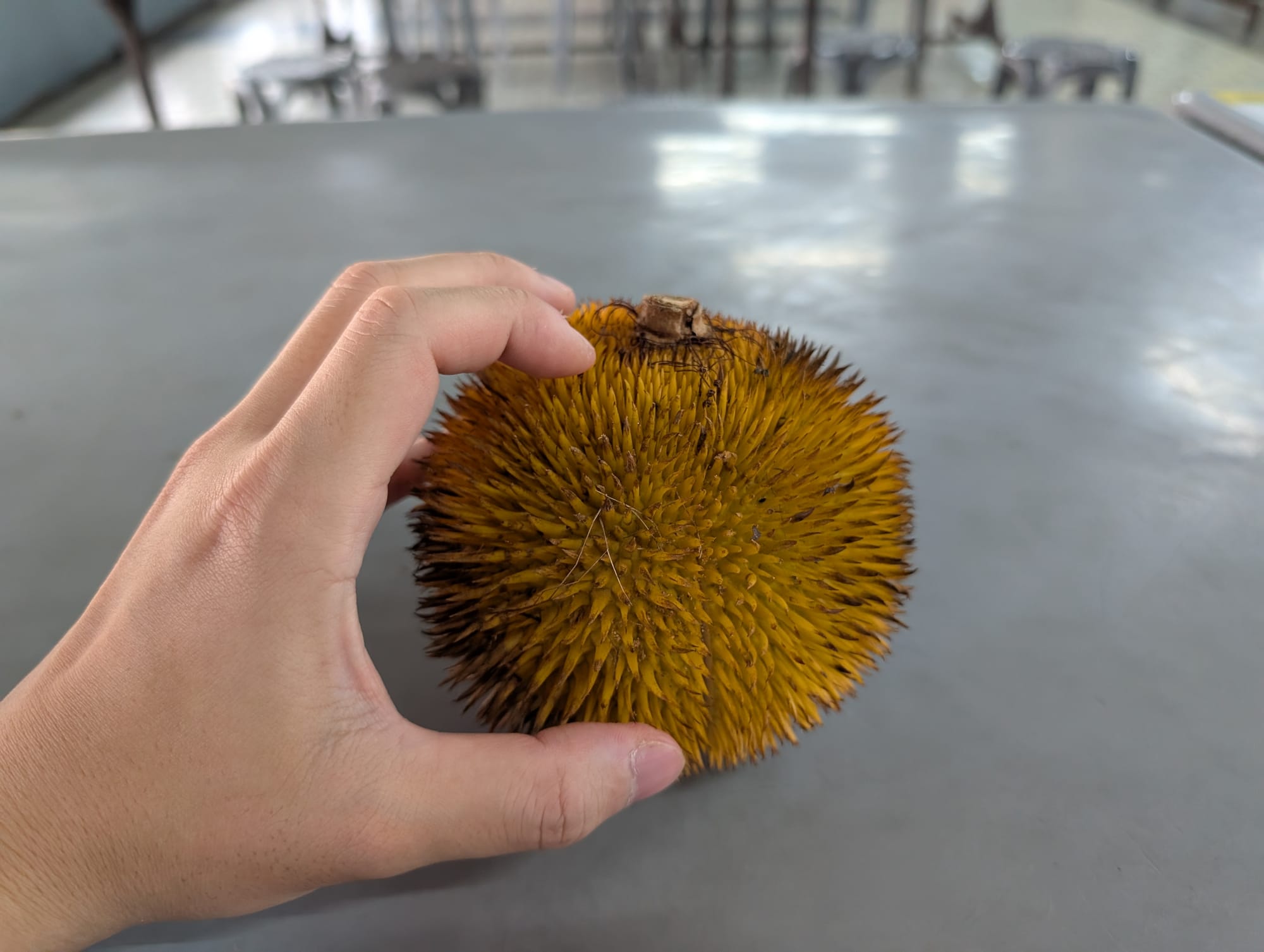 以前紹介したオレンジ色のDurio graveolensと商業品種Durio ZibetinusのハイブリッドであるSuluk Durianとは異なり、球形の形状をしておりかつ大きさが10cm前後とドリアンにしては非常に小さいのが特徴だ。