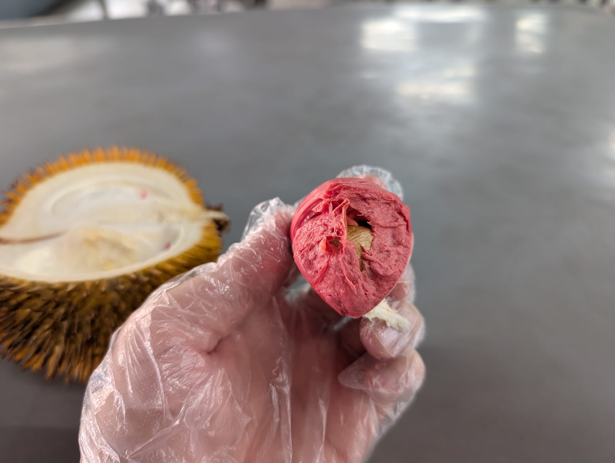 なんとも今まで食べてきたドリアン達とは全く異なる、真紅の房がお目見えだ。