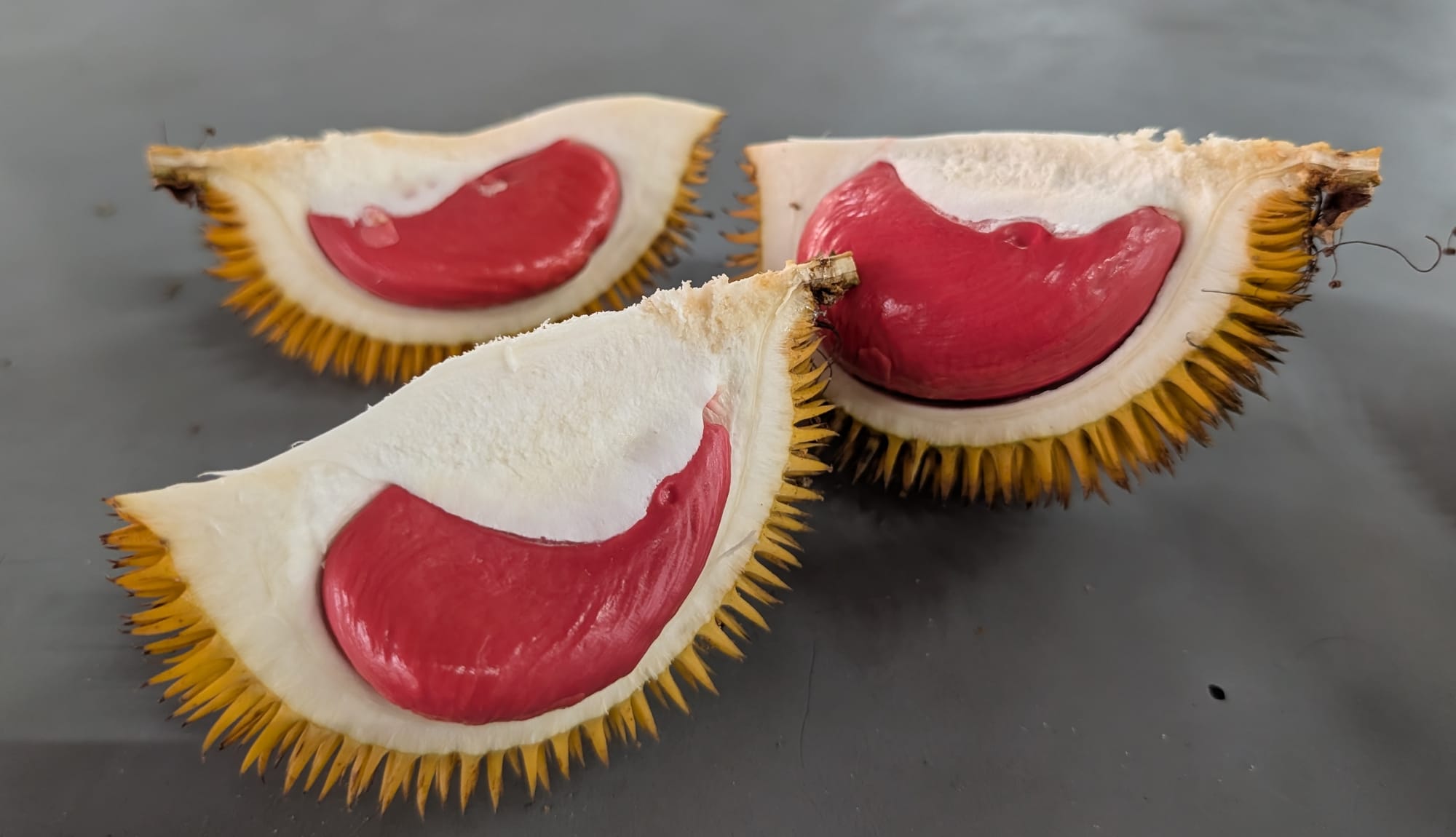 鮮やかで魅力的な外観に反して、掴みどころのない味の赤色Durio graveolens。