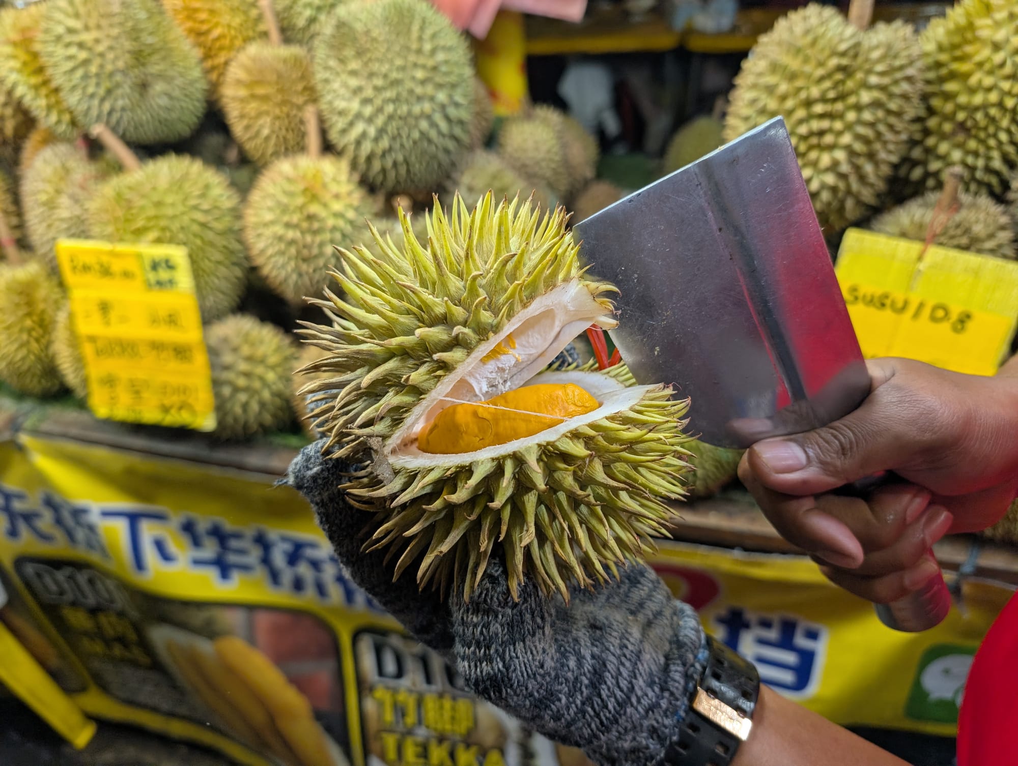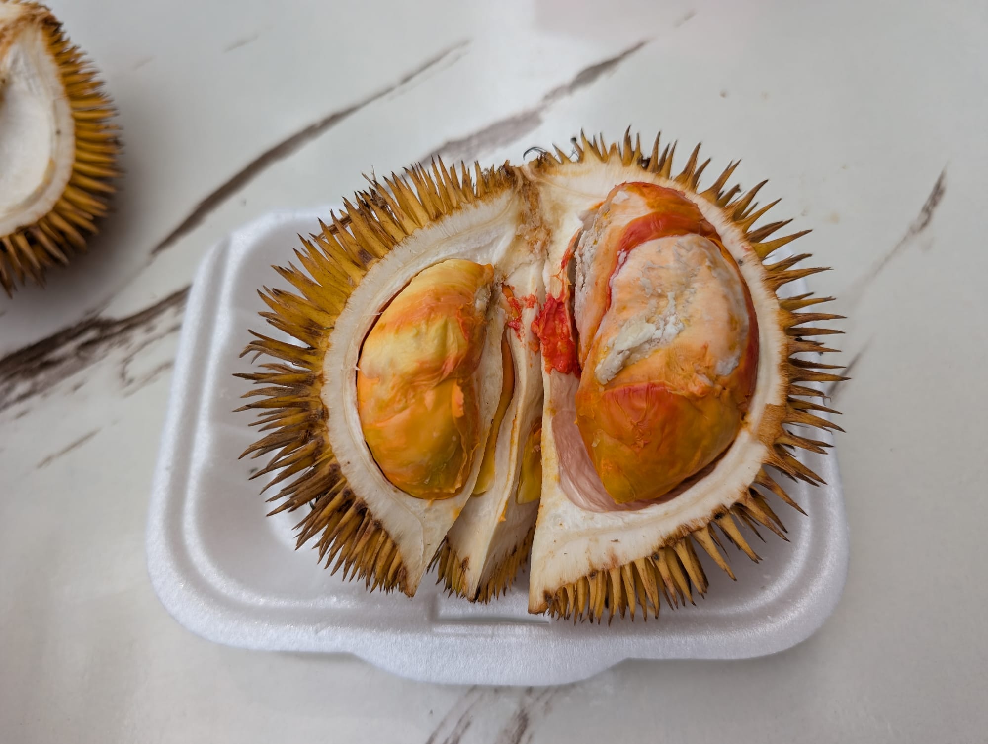 一見するとオレンジ色のDurio graveolensに見えるこのハイブリッド、迂闊に買ってしまうと無味のものを食べることになるので要注意だ。