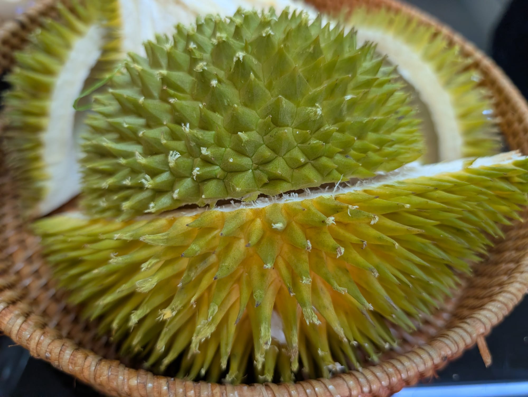 明るいコントラストの黄緑の外皮も、細くて円錐をした棘の形も、商業品種のドリアンとはかけ離れている。