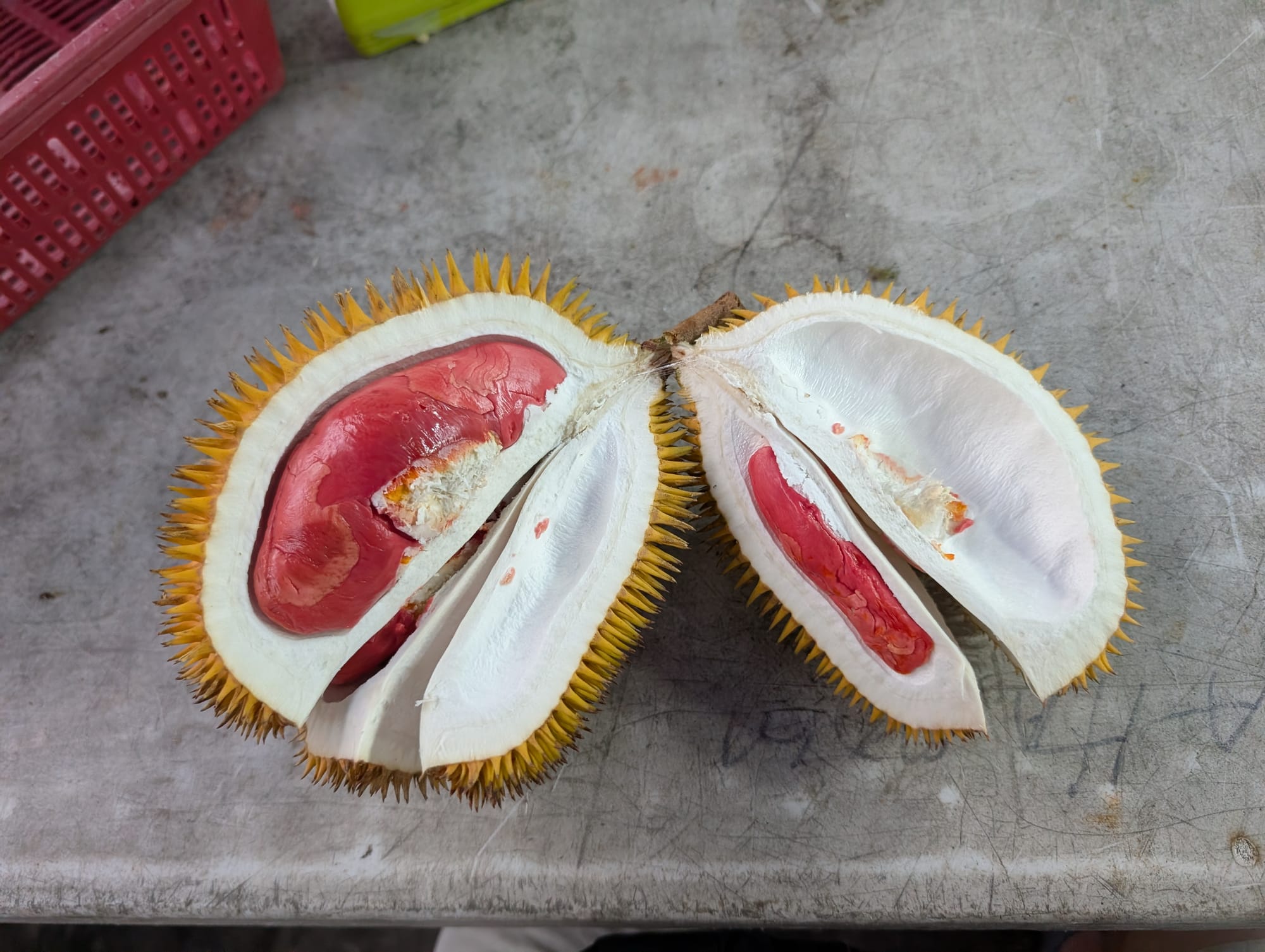 初めて聞く名前だが、調べてみると商用種Durio zibethinusの何かしらの品種とDurio graveolensの赤色を掛け合わせた品種で、コタキナバルで出回っているものらしい。