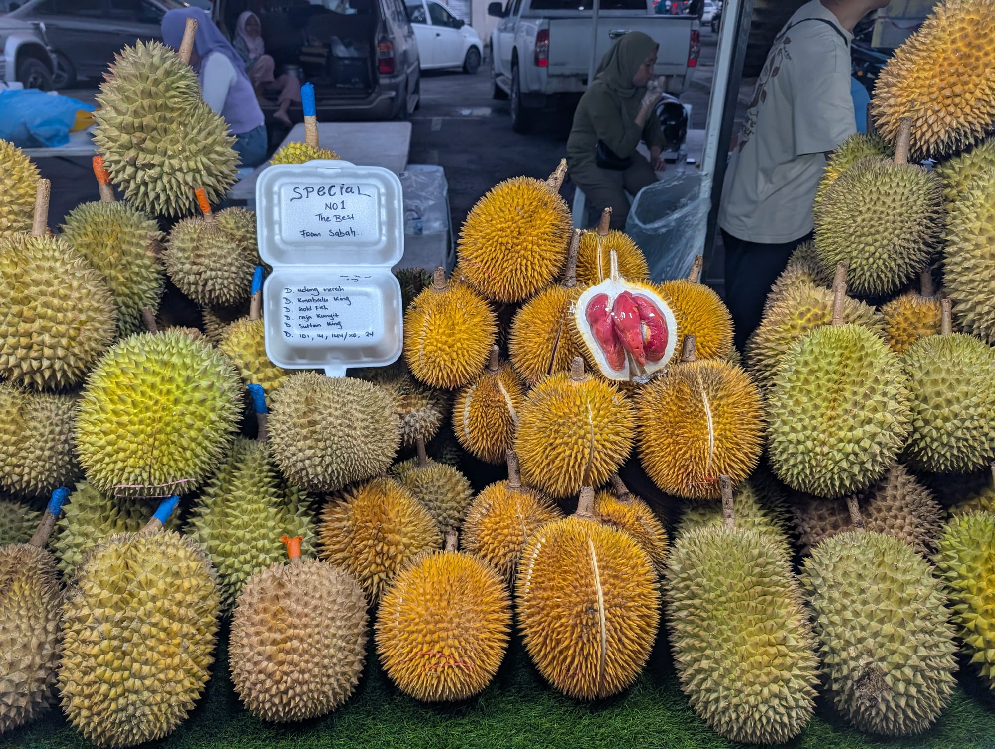 クチンで食べたものはオレンジ色のDurio graveolensとのハイブリッドだったが、Suluk Kingという通称には色の縛りはないらしく、つまりここに置いているのはその赤色版ではないかと予想した。